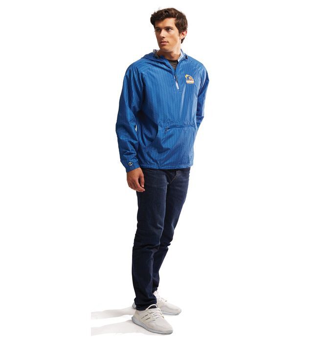 Tech weave printed Micron(tm) lightweight polyester, wind/water resistant fabric * Quarter zip pullover style * Adjustable 3-piece hood with eyelets and concealed cord locks on Adult sizes only (elastic on youth) * Raglan sleeves for maximum mobility * Jacket folds up into zippered front pocket * Half-elastic cuffs * Adjustable bottom hem with hidden shockcord closure in right pocket on Adult sizes only * Water-resistant