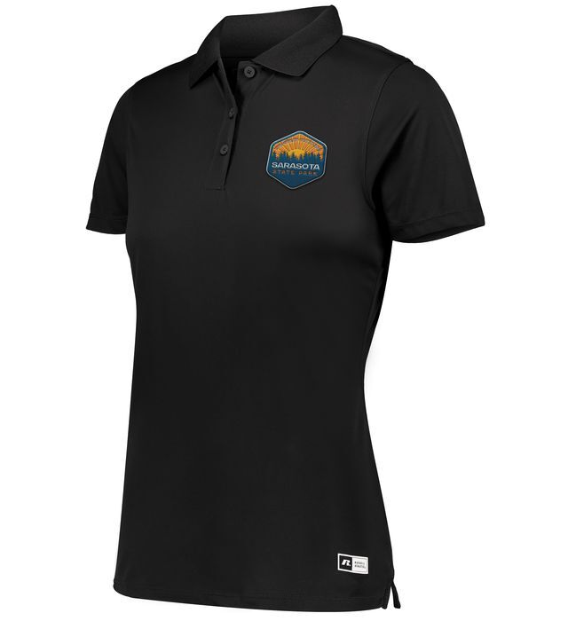 4.0 ounce 100% polyester * Dri-Power(r) Moisture Wicking Technology * Odor protection * Ladies' fit * Tag-free label * RUSSELL ATHLETIC heat sealed label on bottom left front * Ribbed collar * Three-button placket * UPF 30+, provides protection from the sun * Set-in sleeves